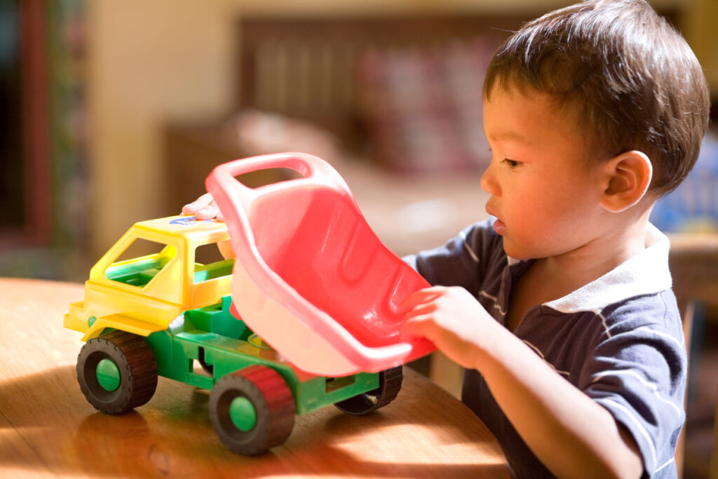 Jouer aux petites voitures, en plus de l’imagination, sollicite la motricité fine et le langage, suscite la coopération entre pairs et fait appel à l’organisation spatiale. Les jeunes enfants, avec leur goût de la précision, aiment installer les voitures pare-choc contre pare-choc à l’intérieur du garage ou le long d’une route. En grandissant, ils s’intéressent de plus en plus aux détails qui distinguent les différents univers : transport de passagers mais aussi voitures de police, camions de pompier, ambulances, engins de chantier, véhicules agricoles, etc. Ces thèmes suscitent soit l’envie de s’isoler pour se raconter son histoire tout seul dans son coin, soit le besoin de trouver des partenaires de jeu pour élaborer un scénario commun. Pour les plus grands, vers 3 ans, l’installation du décor fait partie du jeu et certains auront, en plus des figurines, l’idée de prendre des cubes pour le compléter. Il est donc judicieux de placer les jeux de construction à proximité du coin voitures.