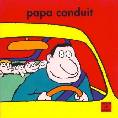 La dernière page termine la série des actions sur une note joyeuse. Elle montre papa qui conduit, comme sur la couverture et, derrière lui, sur la banquette arrière, une ribambelle d’enfants prêts à partir avec lui en promenade.