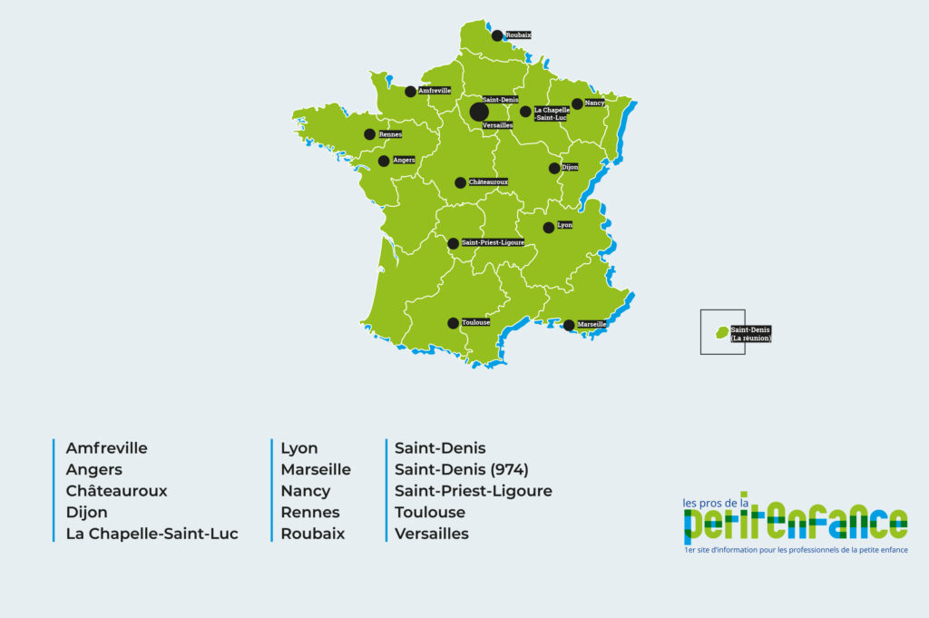 Voici donc représentées sur cette carte les 15 « heureuses élues ». On y trouve des petites communes comme Saint-Priest-Ligoure ou Amefreville ( a commune de Xavier Madelaine, le co-président du groupe petite enfance de l’AMF) , mais aussi de grandes villes comme Marseille, Lyon ou Toulouse et pour l’Outremer Saint-Denis de la Réunion.